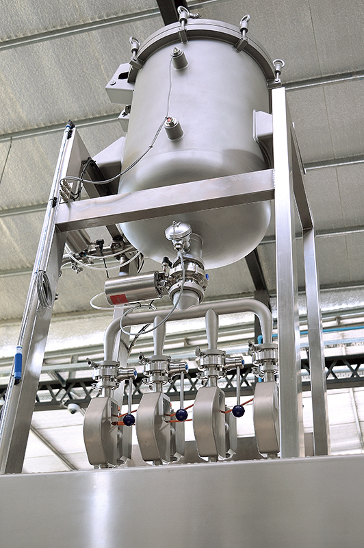 Tanque de producto presurizable con capacidad de 100 litros, colocado sobre la máquina incluyendo las conexiones para alimentación de los 4 picos.